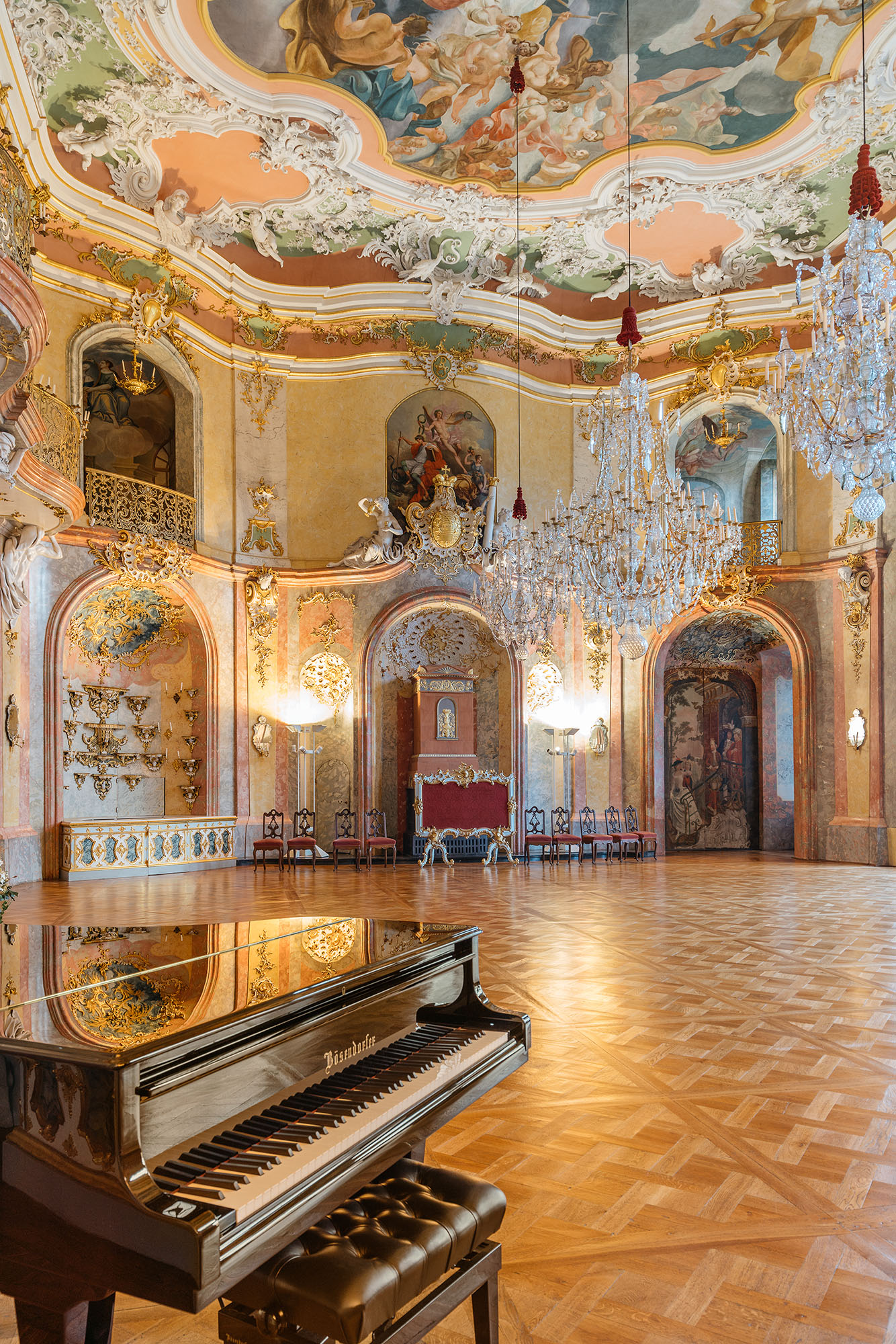 Unter den wachen Blicken von Zeus herrscht im ersten Obergeschoss des Westflügels von Schloss Heidecksburg geschäftiges Treiben. Die mobile Ausstattung wird beräumt, Kronleuchter werden bald zu Boden gelassen und eingehaust und im Festsaal steht der Aufbau eines Raumgerüsts bis unter die kunstvolle Decke mit den auf Wolken gebetteten Göttern an. Für die Dachsanierung bleiben die Wohn- und Festräume der Beletage des Westflügels in den kommenden drei Jahren geschlossen. Die wertvolle Innenausstattung mit Stuck und Malereien im ersten und zweiten Obergeschoss wird während der Arbeiten im Dach von den Restauratoren engmaschig überwacht. Zu sehen gibt es auf Schloss Heidecksburg für Besucherinnen und Besucher aber weiterhin viel, das Museum mit der Gemäldegalerie im Südflügel, der fantasievollen Ausstellung Rococo en miniature und dem Naturhistorischen Museum bleibt geöffnet und freut sich über Besuch.