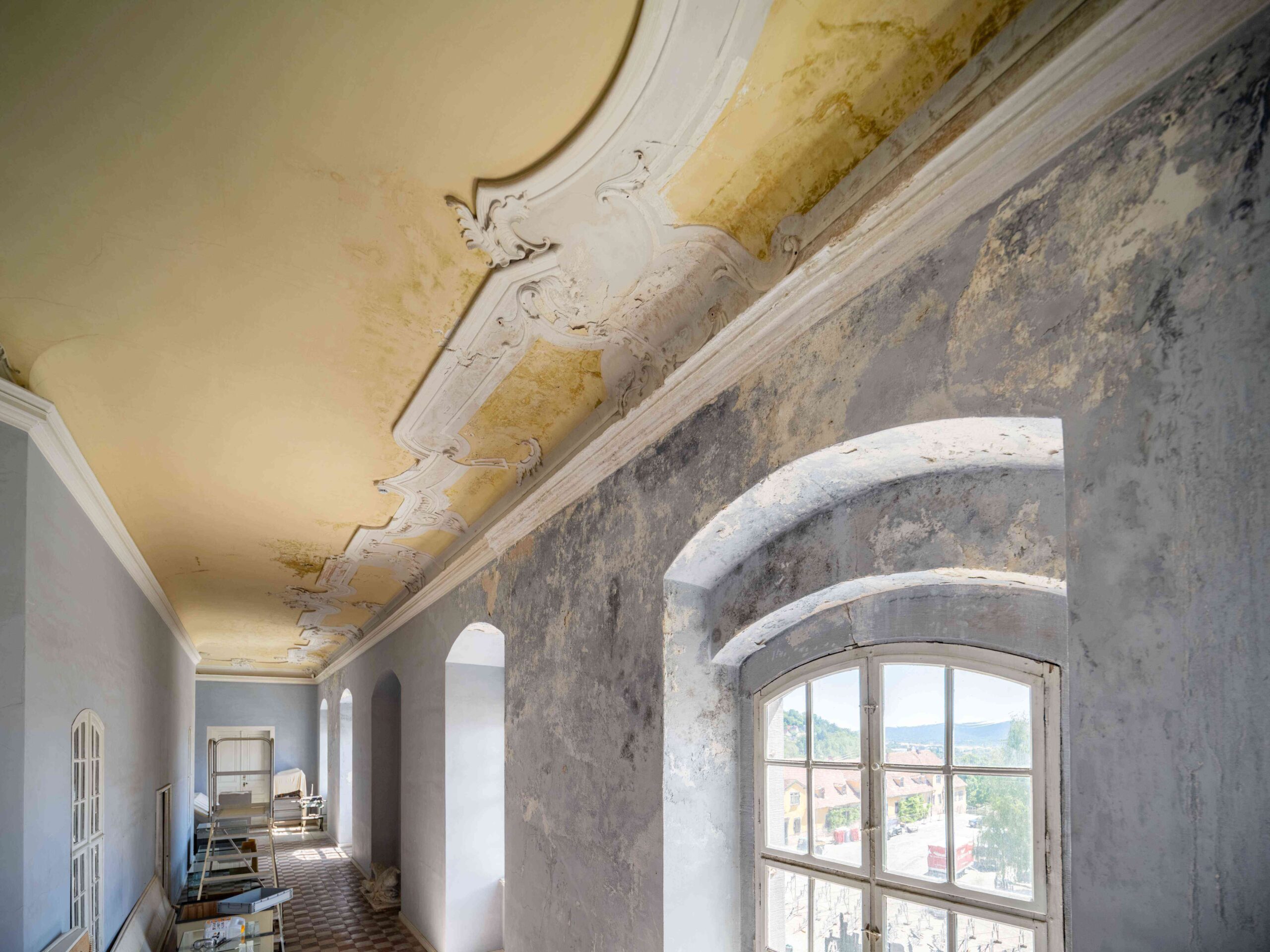 Foto: Schatzkammer Thüringen, Marcus GlahnNeben dem Olymp zeichnet sich an der Decke des Festsaals bereits ein Wasserfleck ab. Auch Versalzungen sind auf dem Stuckmarmor im Saal zu erkennen. Ins Auge fallen die Feuchteschäden besonders im zweiten Obergeschoss, direkt unter dem Dach. In der Galerie, die zuletzt als Museumsdepot diente, sind die dunklen Flecken an Decke und Wänden gut zu erkennen.