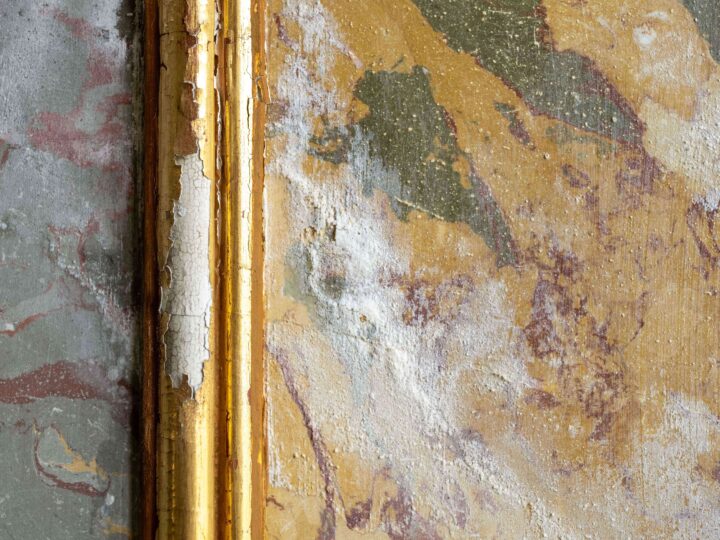 An den Wänden des Festsaals zeigen sich auf dem bunten Stuckmarmor bereits weiße Ablagerungen, bedingt durch die eingedrungene Feuchtigkeit.