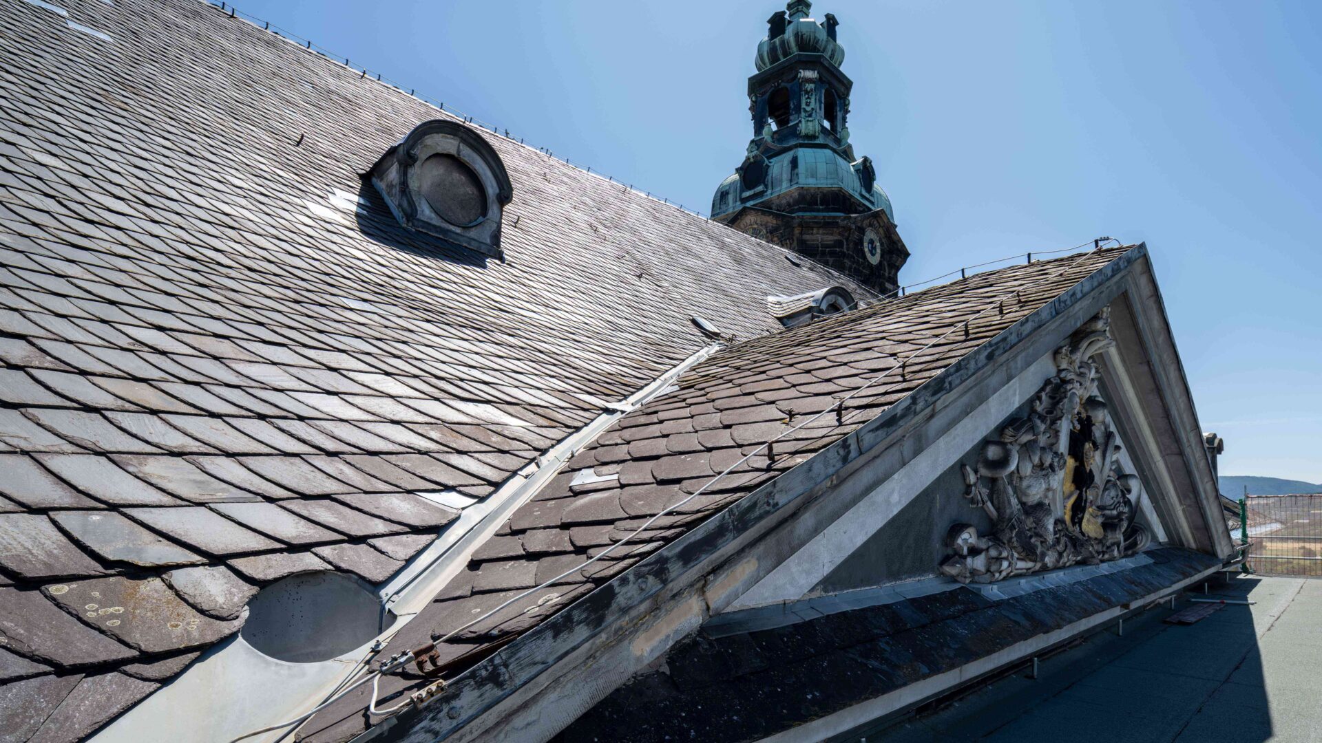 Foto: STSG, Andrè KranertAb Frühjahr 2026 gehen dann die Dachdecker und Zimmerleute ans Werk. Das Dach am Westflügel ist stark geschädigt, insbesondere in den Traufbereichen. Hier hat sich die Feuchtigkeit gestaut, die durch die undichte Schieferdeckung lange eingedrungen ist. Aber nicht nur die hölzerne Dachkonstruktion hat Schäden. Die eingedrungene Feuchtigkeit macht sich auch an der kunstvollen Innenausstattung im ersten und zweiten Obergeschoss des Westflügels bereits bemerkbar.