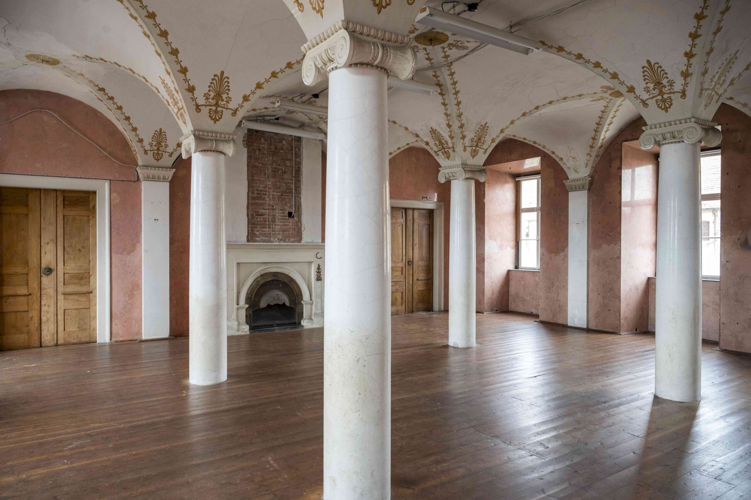 An den Wänden des Festsaals zeigen sich auf dem bunten Stuckmarmor bereits weiße Ablagerungen, bedingt durch die eingedrungene Feuchtigkeit.