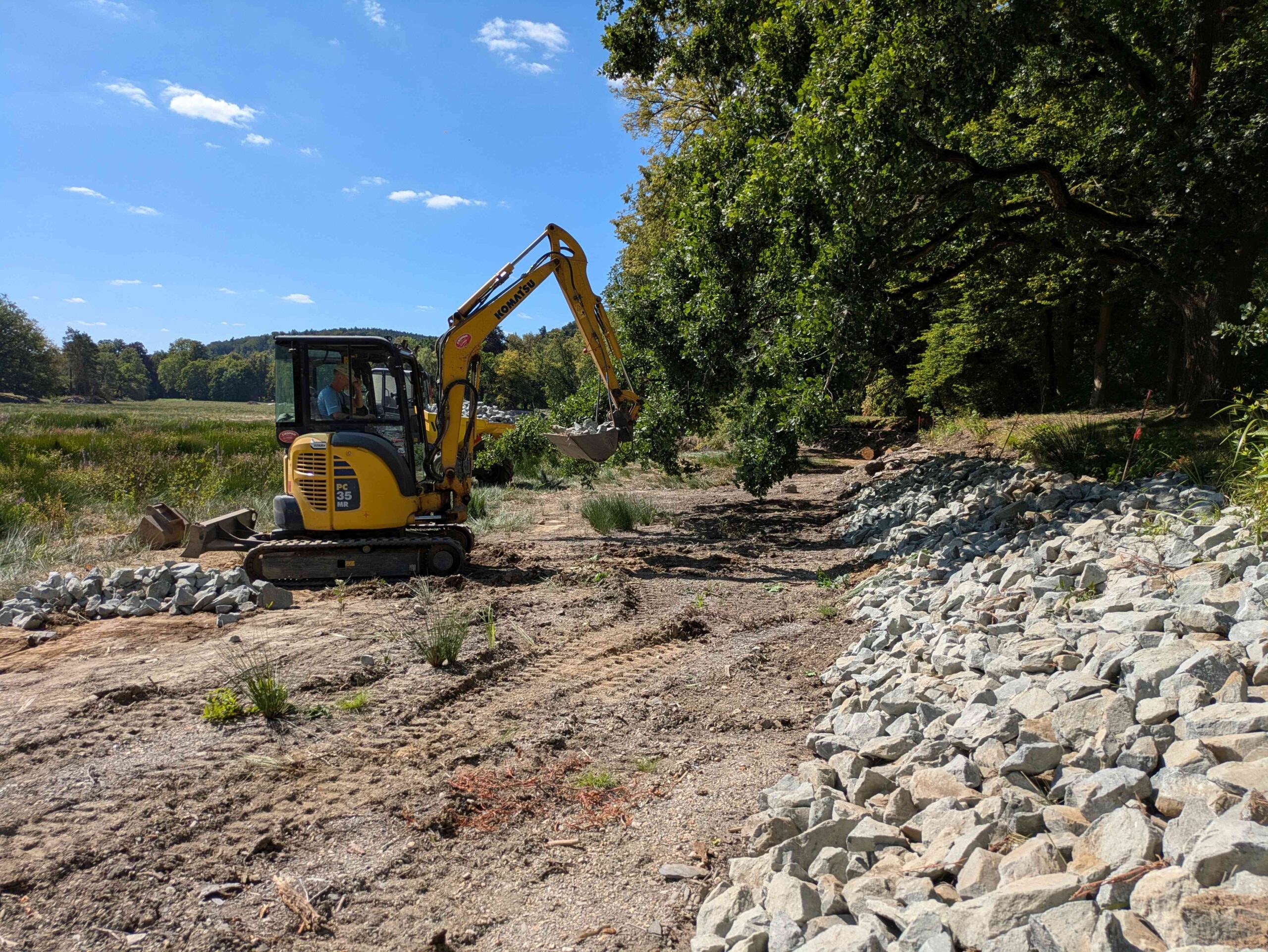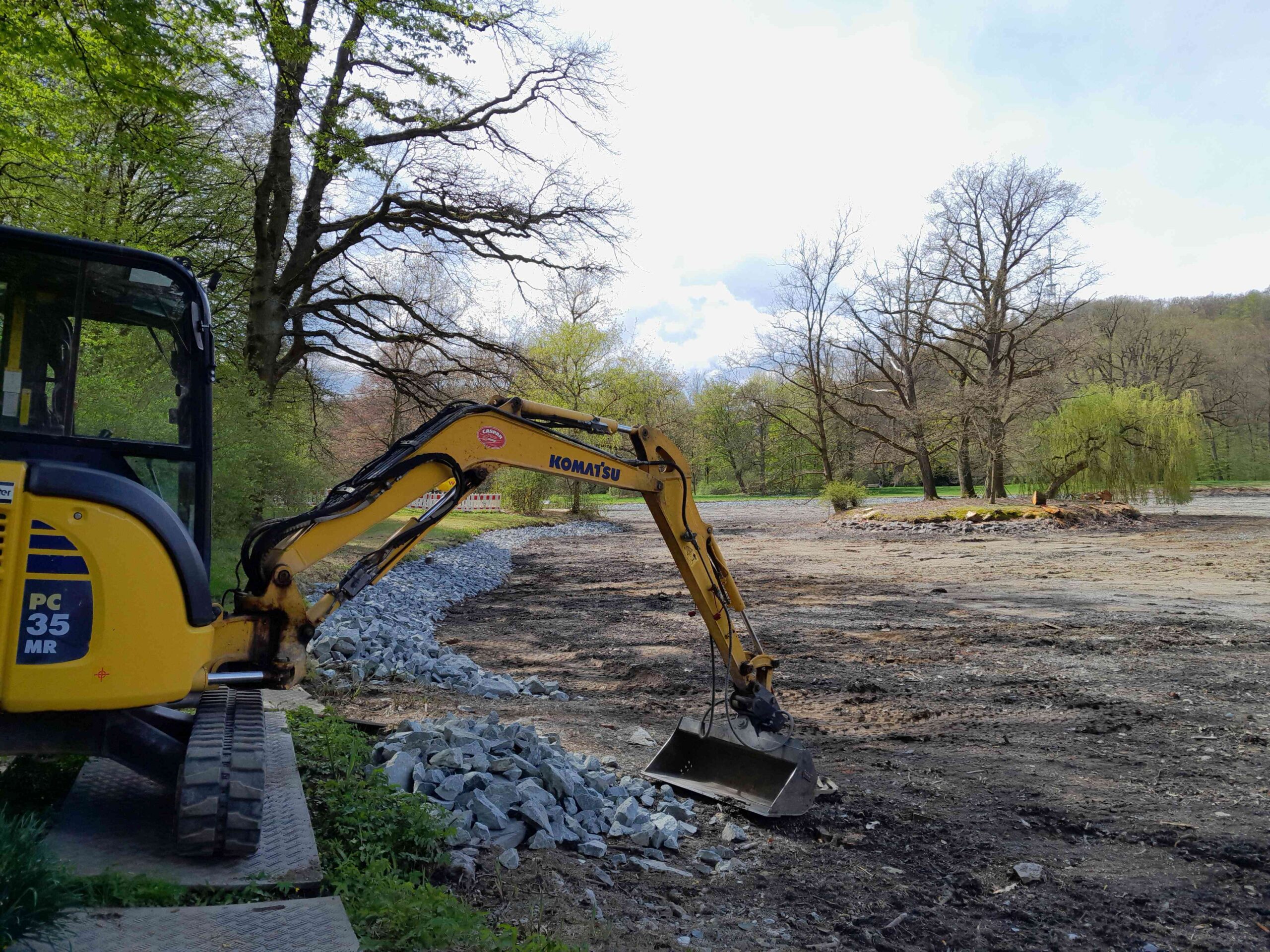 Ende 2024 folgte im nächsten Schritt das Ablassen des Wassers aus dem See, sodass Bagger mit dem Entschlammen der ufernahen Bereiche beginnen konnten. Auch ausgespülte Uferbefestigungen an der Ostseite wurden wieder instandgesetzt. „Die Linienführung der Ufer gehört mit zum Kunstwerk“, erklärt Gartenreferent Hagner die Bedeutung der Ufersanierung. „Die Uferlinien waren mit der Zeit bereits verschwommen, ihr früherer Verlauf war aber noch an den Fußpunkten ablesbar. Die Ufer wurden bei der Anlage des Sees mit einer Steinschüttung befestigt, das Gestein ist jedoch mit der Zeit erodiert. Im Zuge der Ufersanierung haben wir weite Bereiche in Anlehnung an die historische Bauweise neu befestigt.“