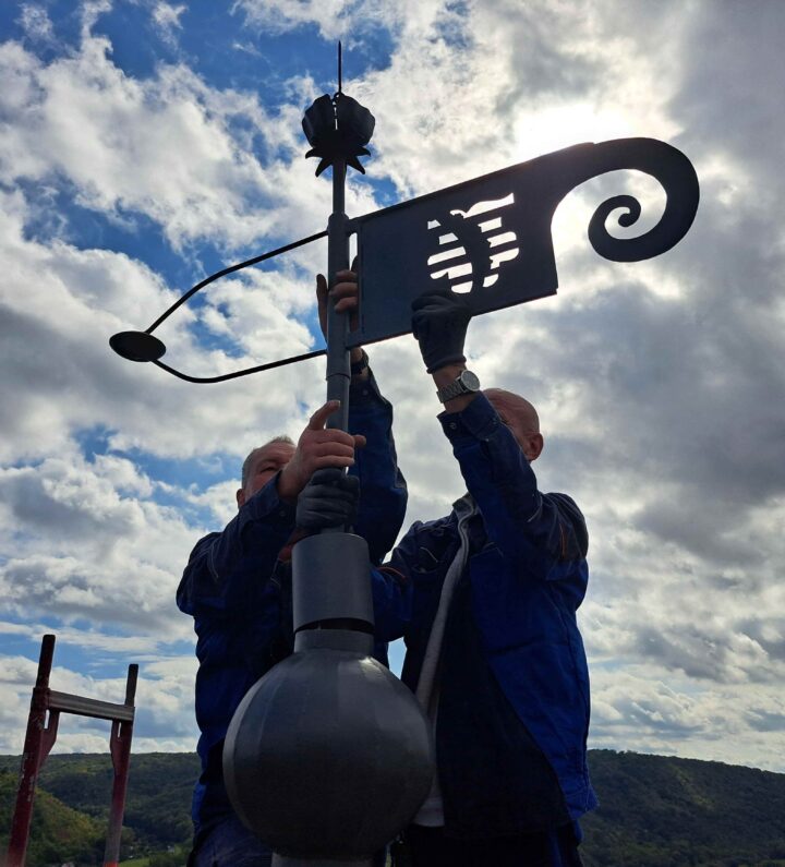 Zwei Mitarbeiter der Firma Fuchs + Girke Bau und Denkmalpflege GmbH beim Wiederaufsetzen des restaurierten Turmknopfes und der Wetterfahne auf der Turmhaube des Renaissanceschloss über dem Saaltal.