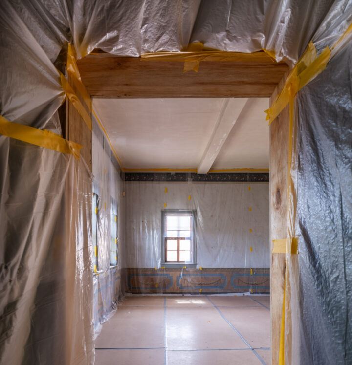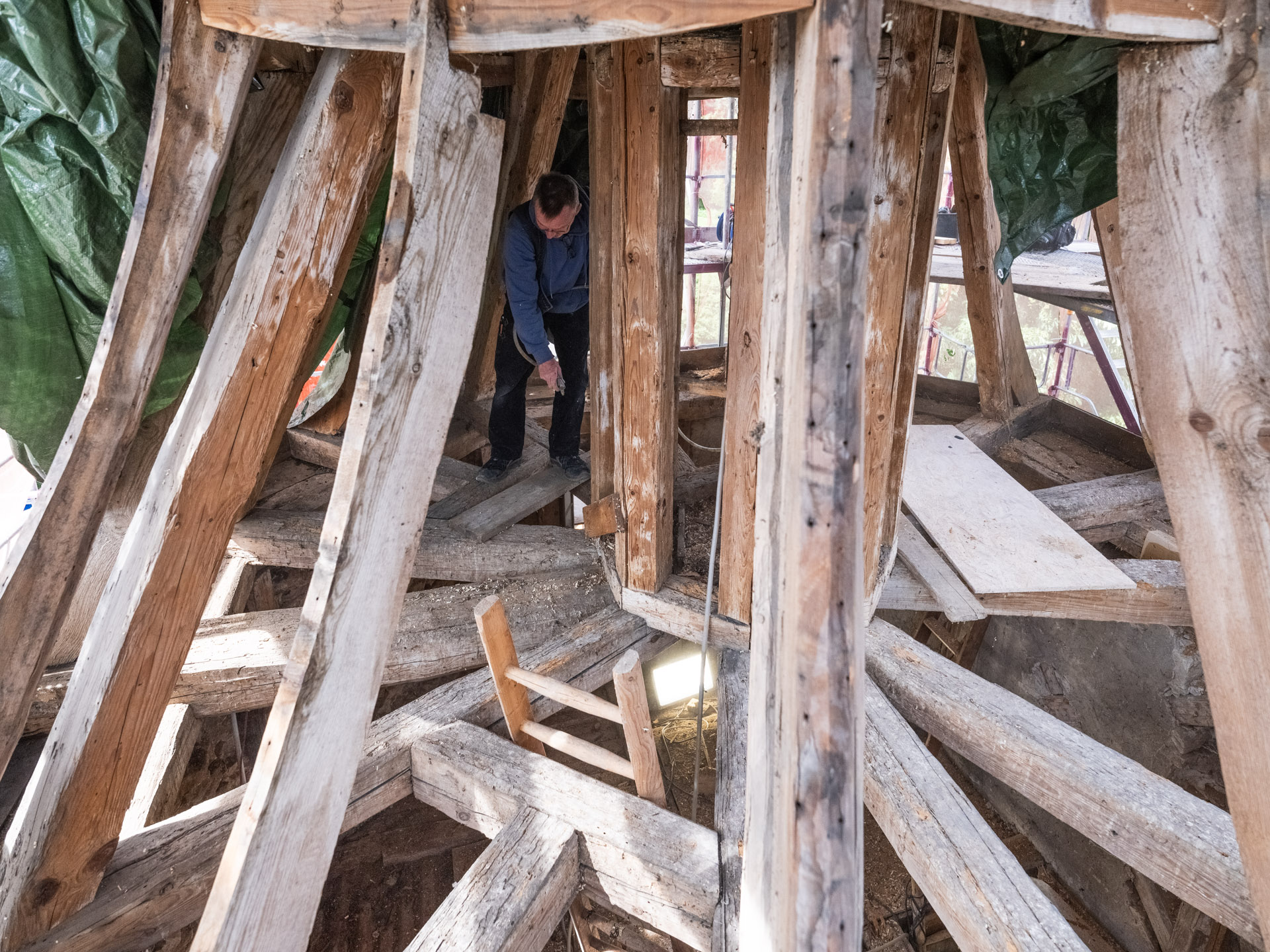 Im Zuge der Bauarbeiten wird das Dach abschnittweise geöffnet und der darunterliegende historische Dachstuhl im Bestand saniert. Als erster Etappensieg konnte im September die Sanierung der Turmhaube über dem Treppenturm abgeschlossen werden. Rund 400 Jahre ist die Haubenkonstruktion alt.
