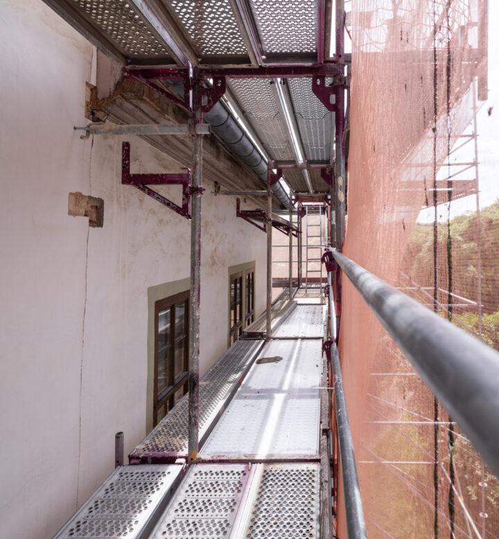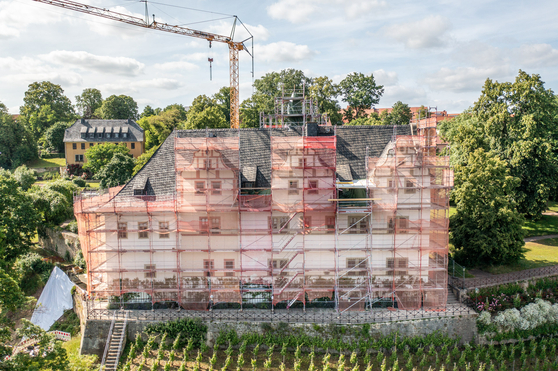 Foto: STSG, Philipp HortSowohl die Witterung, als auch das Alter und Umbauten im 20. Jahrhundert haben am Renaissanceschloss gezehrt. Konstruktive Verbindungen sind über die Zeit geschwunden. Ein Anbau aus der Zeit um 1800, in dem Goethe seinerzeit schon nach Ruhe und Inspiration suchte, driftet langsam ab. Seit Anfang des Jahres gehen jetzt Handwerker im beräumten Renaissanceschloss ein und aus. Auch sie dichten, aber im weniger literarischen Sinn. Die Arbeiten im Rahmen der Dachsanierung laufen auf Hochtouren. Aber auch die Fassaden und vor allem die Baukonstruktion stehen im Fokus der Sanierung.