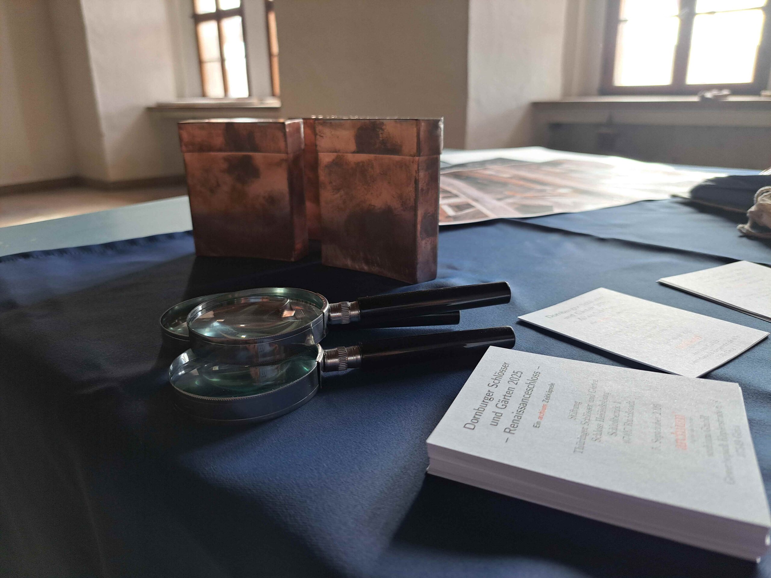 Mikrodrucke mit Fotos und Plänen, Münzen und mehr wurden in drei Zeitkapseln für den Turmknopf des Dornburger Renaissanceschlosses eingelegt.