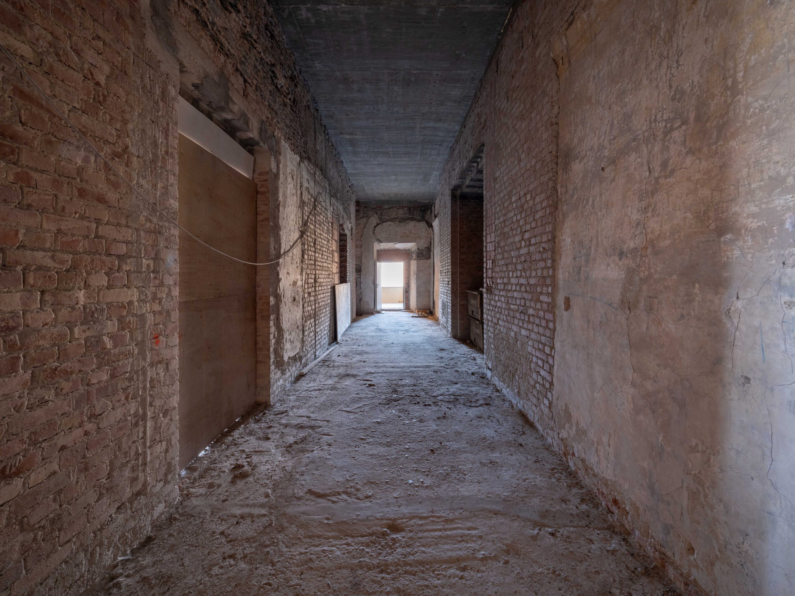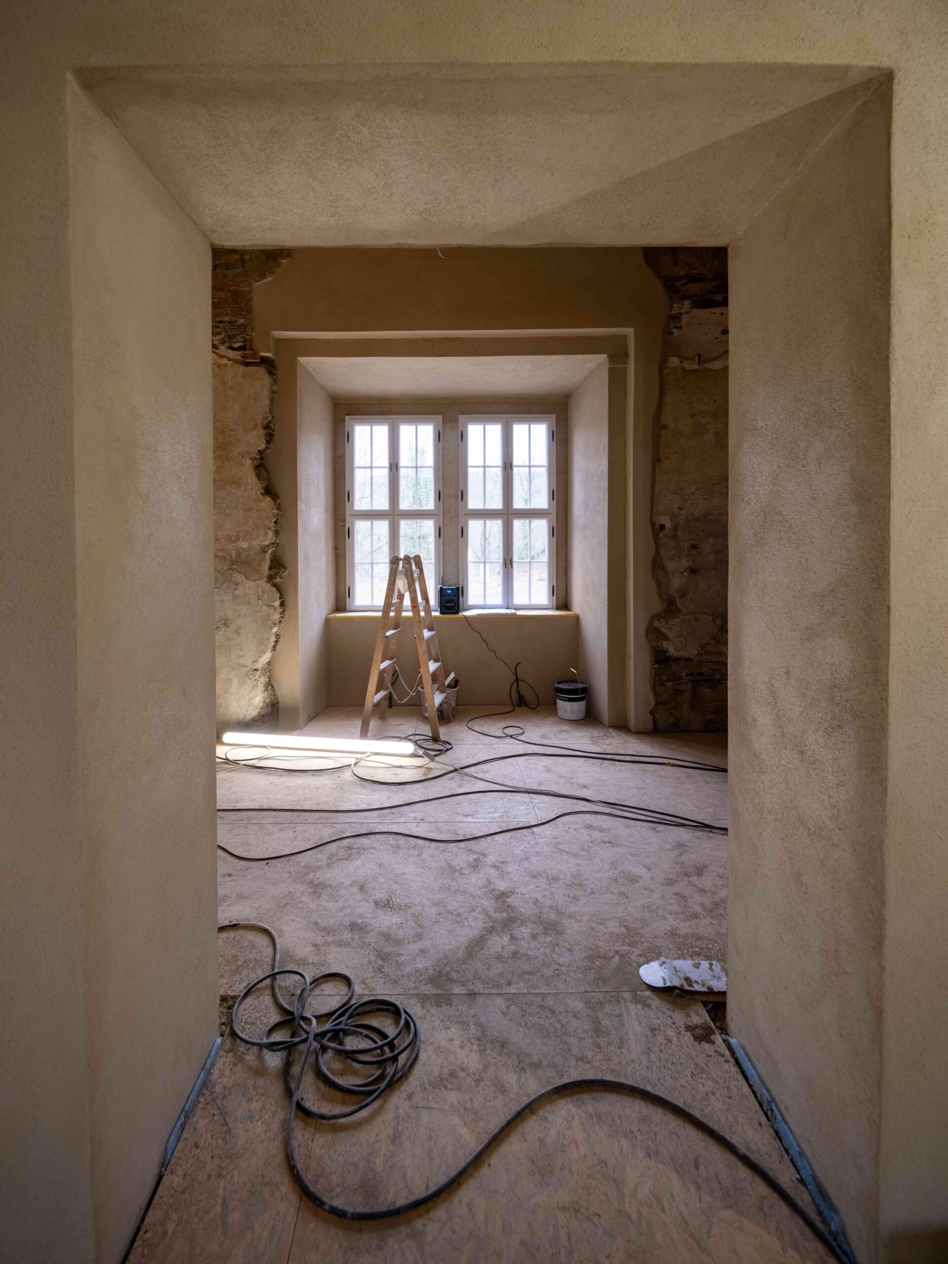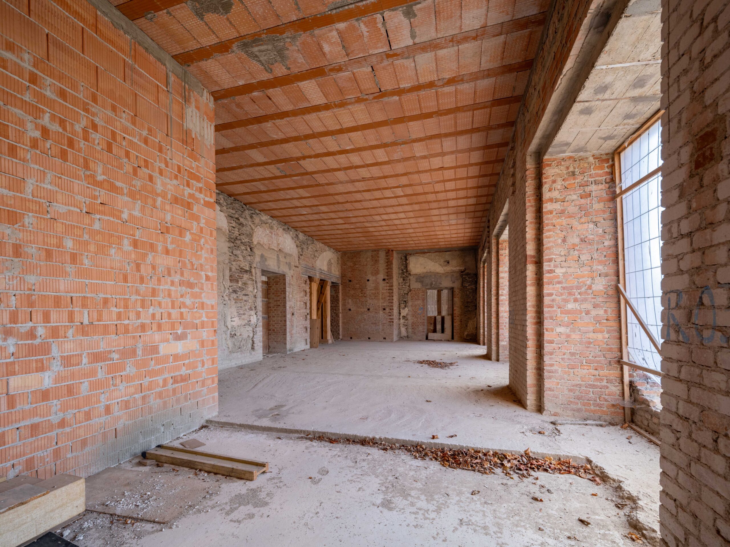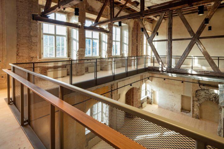 Durch die gravierenden Eingriffe in den 1940er Jahren entstanden auch im Erdgeschoss des Hauptgebäudes neue Raumstrukturen, deren Dimensionen ebenso wie die an den Wänden ablesbaren Spuren der Entkernungs- und Umbauarbeiten unter den Nationalsozialisten als Zeitspuren erhalten bleiben.