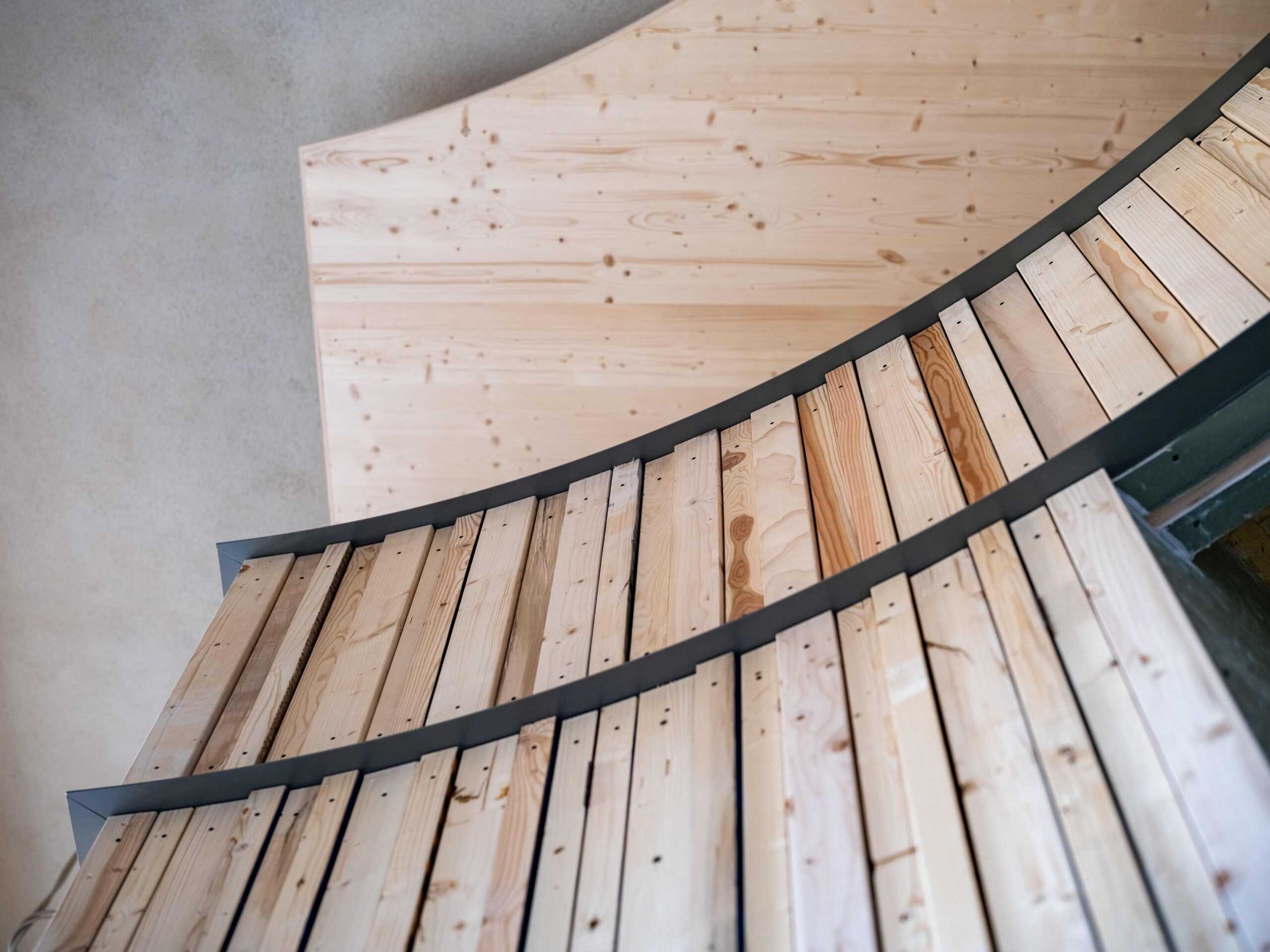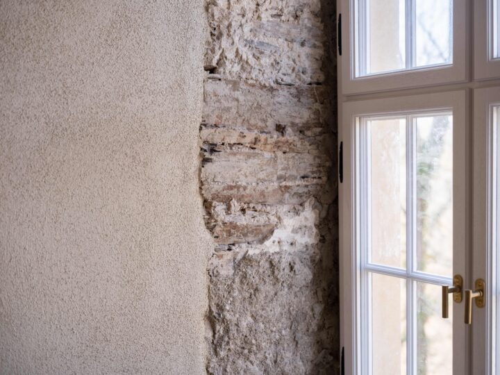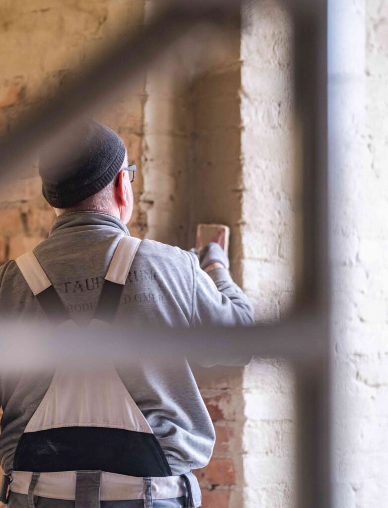 Bei der Sanierung spielen auch erneuerbare Energien und das zirkuläre Bauen eine Rolle. Nicht nur die Wände haben wechselvolle Zeiten erlebt, deren Spuren – von den Wandfassungen der fürstlichen Räume über Einschreibungen aus den 1950er Jahren bis hin zu Spuren der Entkernungsarbeiten aus den 1940er Jahren – natürlich auch in diesem Sanierungsbereich bewahrt werden. Aber auch der neue Thekenbereich hat eine Vorgeschichte. Seine Verkleidung besteht aus Recyclingmaterial von einem ehemaligen Pavillon der Bauhaus-Universität Weimar.