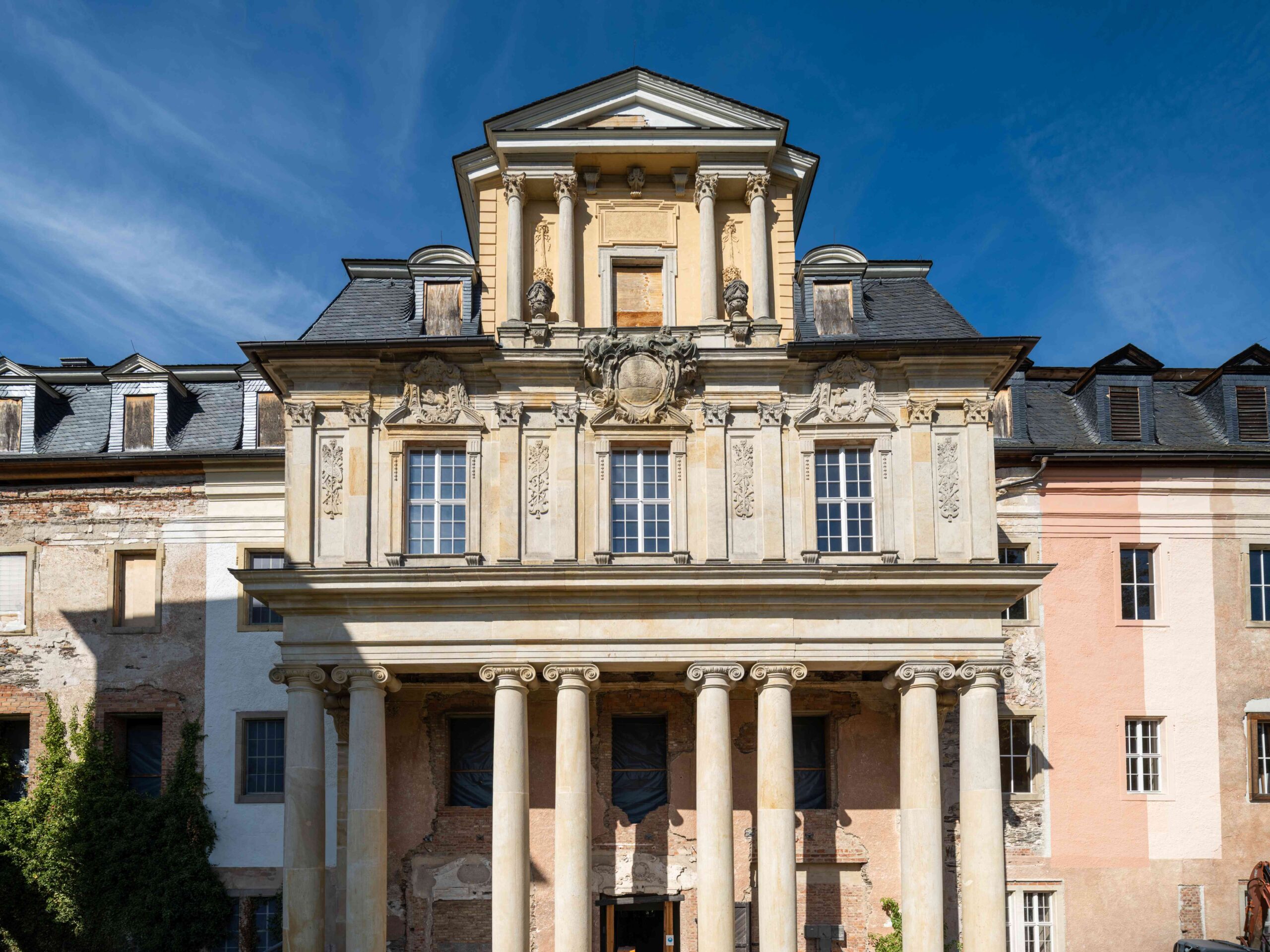 Foto: IBA Thüringen, Thomas MüllerBis 2019 wurde zunächst ein neuer nördlicher Gebäudeabschluss mit Treppenhaus geschaffen. Bei den gravierenden Umbauarbeiten der 1940er Jahre waren auch alle Treppen im Hauptgebäude abgerissen worden. Gefördert mit Mitteln aus dem Bundesprogramm Nationale Projekte des Städtebaus wurde der nördliche Bereich des Hauptgebäudes dann im Rahmen der Internationalen Bauausstellung (IBA) Thüringen bis 2021 wieder nutzbar gemacht – der ehemalige Hauptsaal des Schlosses, der Ahnensaal, und der Emporensaal sind seither als erste Räume wieder zugänglich.