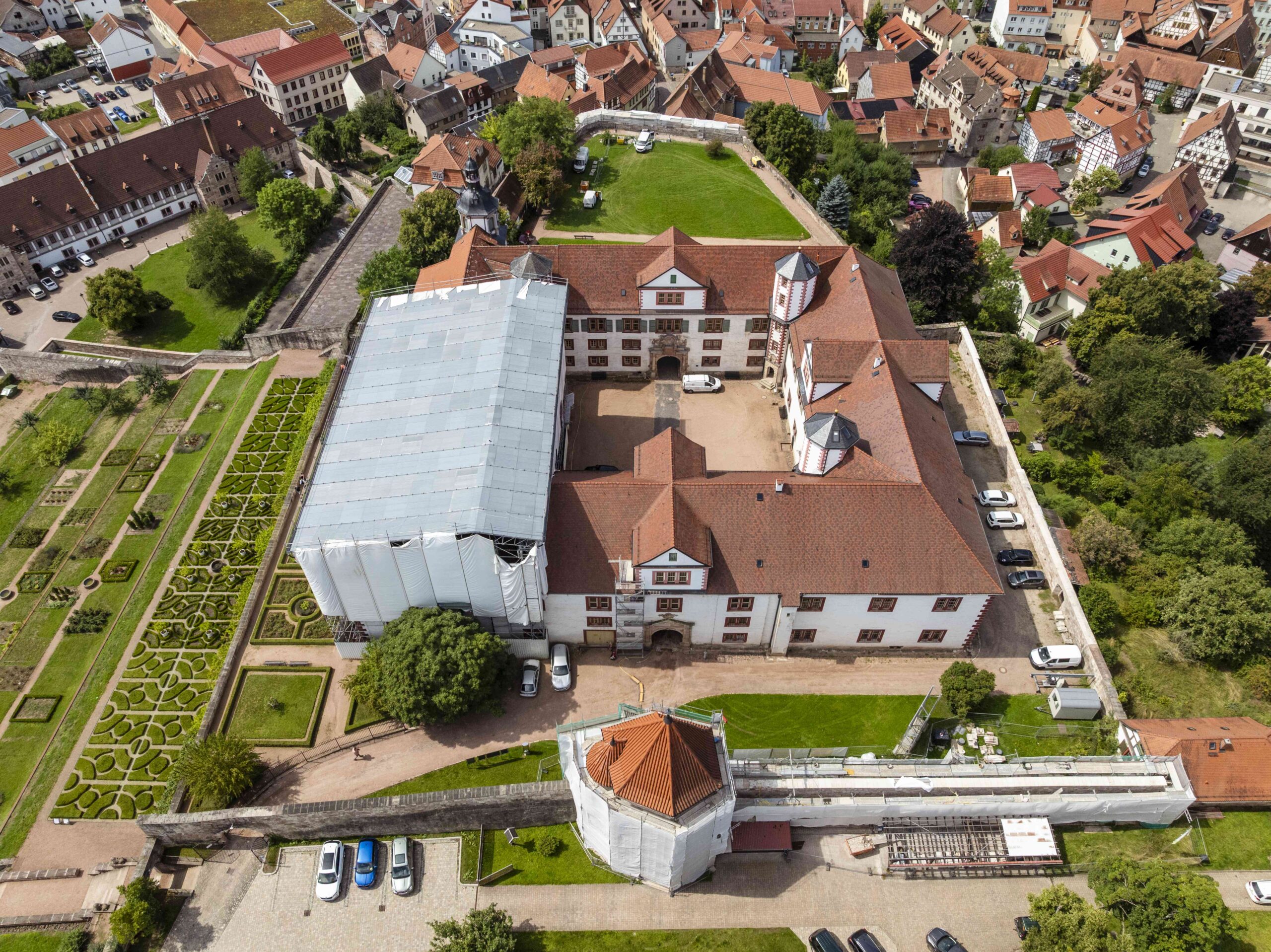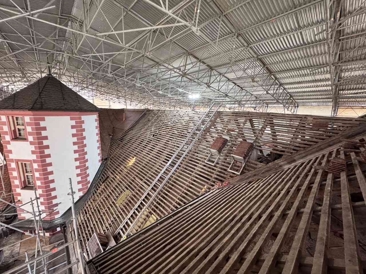 Saniert wird das Dach des Südflügels bis 2029 in zwei Abschnitten. Zunächst kommt der östliche Teil der Dachkonstruktion in die Kur, dann der westliche. Gearbeitet wird in luftiger Höhe unter dem Schutzdach. Nach der Abnahme der Dachziegel wird zunächst dekontaminiert. Dann gehen die Zimmerleute ans Werk. Der historische Dachstuhl, Zwerchhäuser und Deckenbalken werden im Bestand saniert.