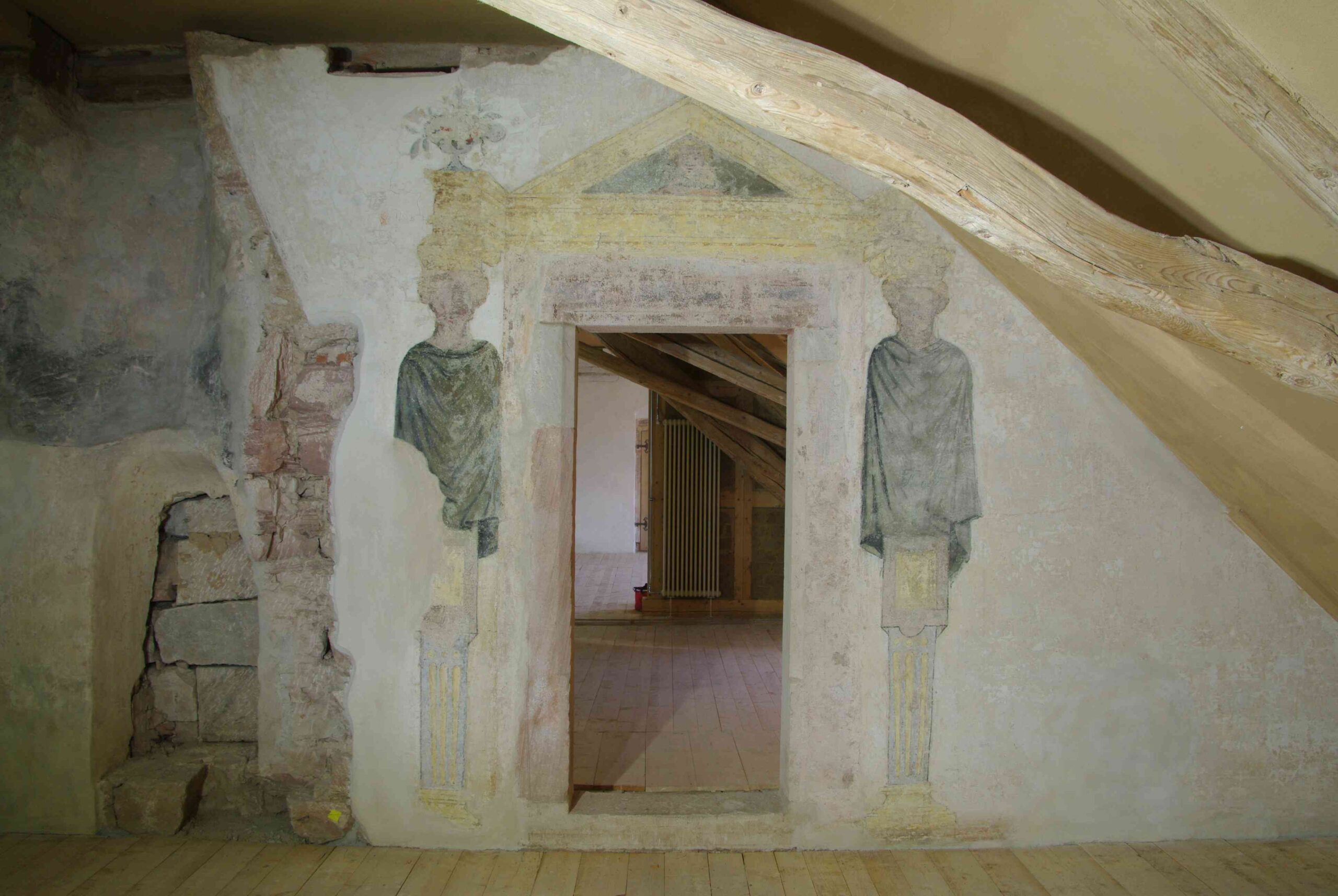 Foto: STSG, Thomas MüllerBis 1820 besaß das Schloss ein repräsentativ ausgestattetes zweites Obergeschoss mit acht Gemächern, das durch den Abtrag schadhafter Zwerchhäuser dann verkleinert wurde. Abseits der Aufmerksamkeit blieben im Dachgeschoss noch Malereien aus der Erbauungszeit des Schlosses mit der originalen Malschicht ohne spätere Überarbeitungen und Restaurierungen erhalten – ein wahrer Schatz, an dem die Zeit und raumklimatische Schwankungen allerdings ihre Spuren hinterlassen haben.