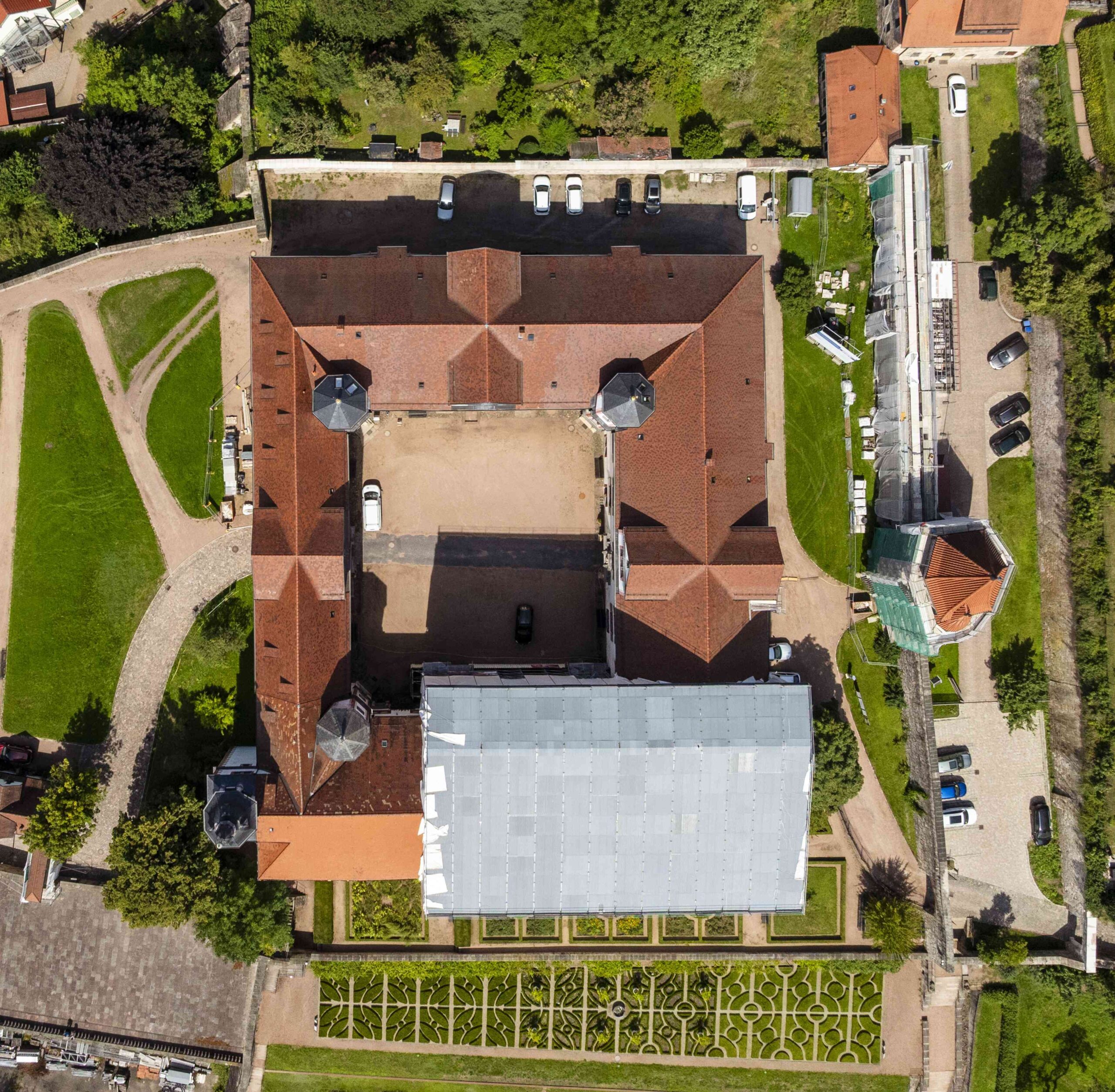 Saniert wird das Dach des Südflügels bis 2029 in zwei Abschnitten. Zunächst kommt der östliche Teil der Dachkonstruktion in die Kur, dann der westliche. Gearbeitet wird in luftiger Höhe unter dem Schutzdach. Nach der Abnahme der Dachziegel wird zunächst dekontaminiert. Dann gehen die Zimmerleute ans Werk. Der historische Dachstuhl, Zwerchhäuser und Deckenbalken werden im Bestand saniert.