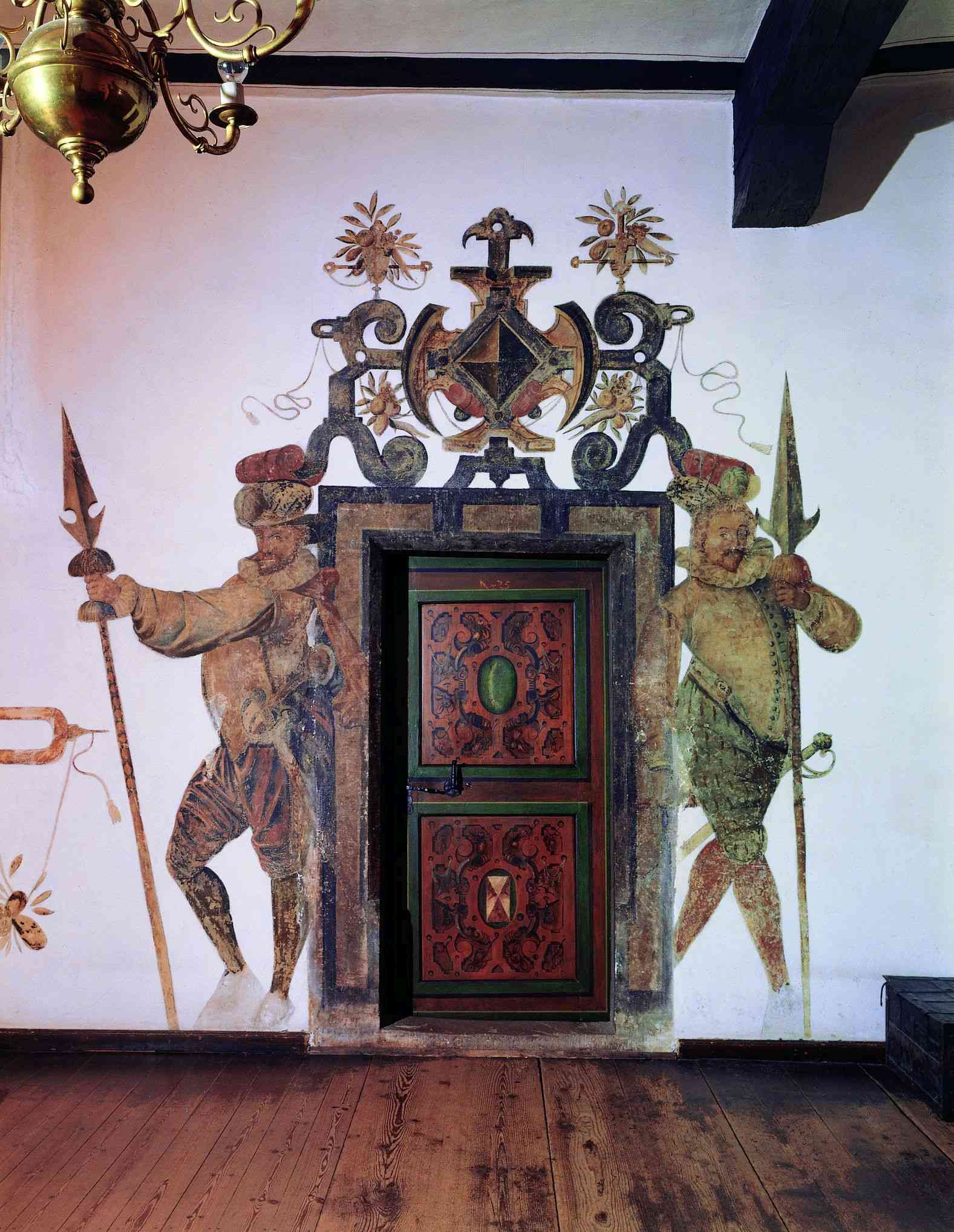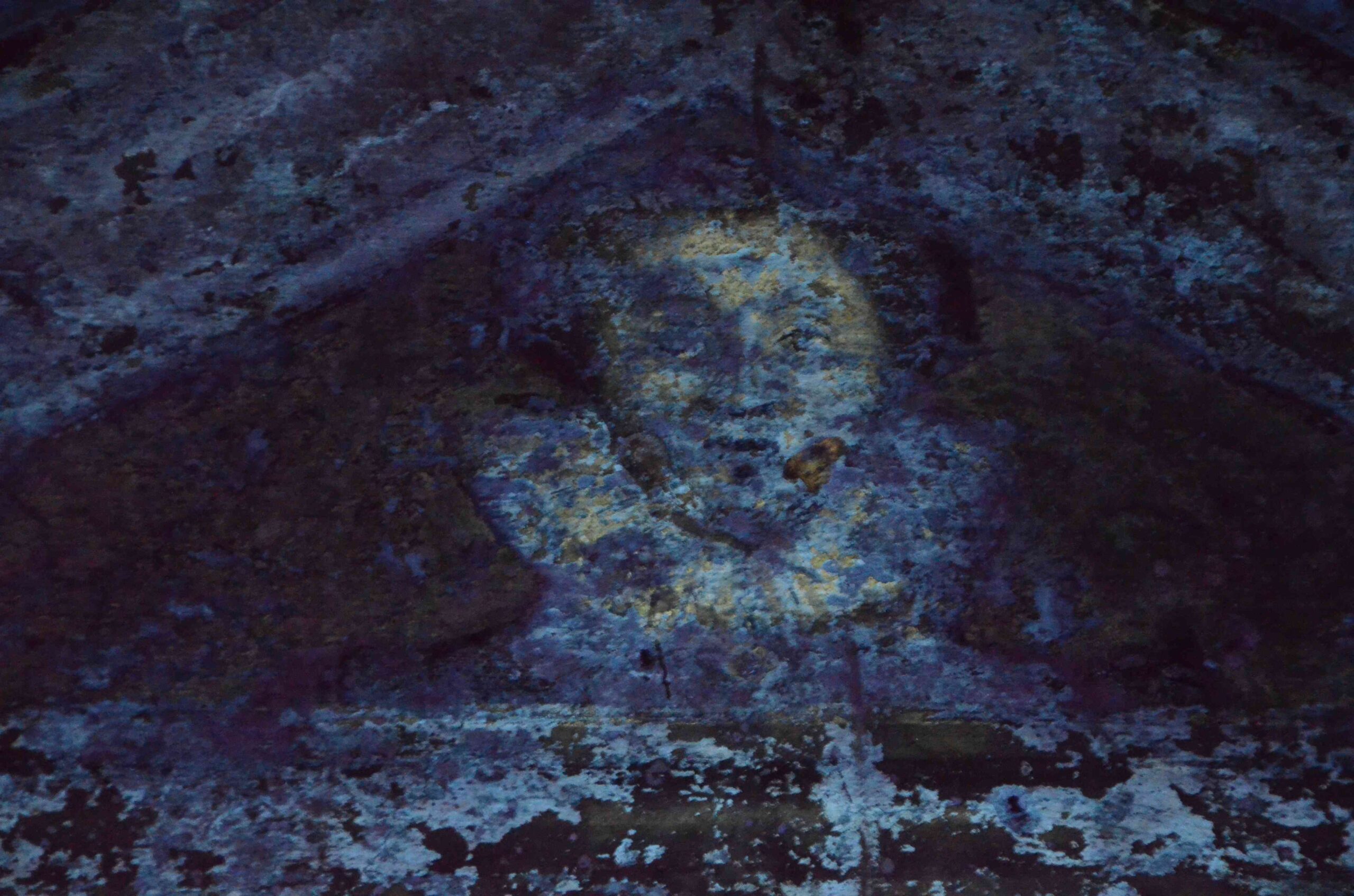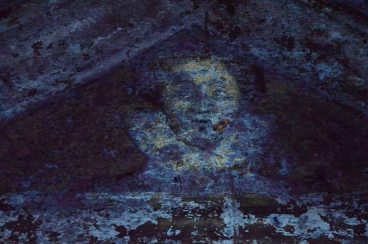 Eine UV-Aufnahme, die in Vorbereitung der Sicherung der Wandmalereien im Nordflügeldach 2016/2017 entstand, veranschaulicht den Detailreichtum der erhaltenen Wandmalereifragmente im Dachgeschoss. Über dem Türsturz sind im UV-Licht die fein gemalten Gesichtszüge eines Kopfes mit Renaissancekragen gut zu erkennen. Das Bleiweiß der Malerei tritt durch die Fluoreszenz deutlich hervor.