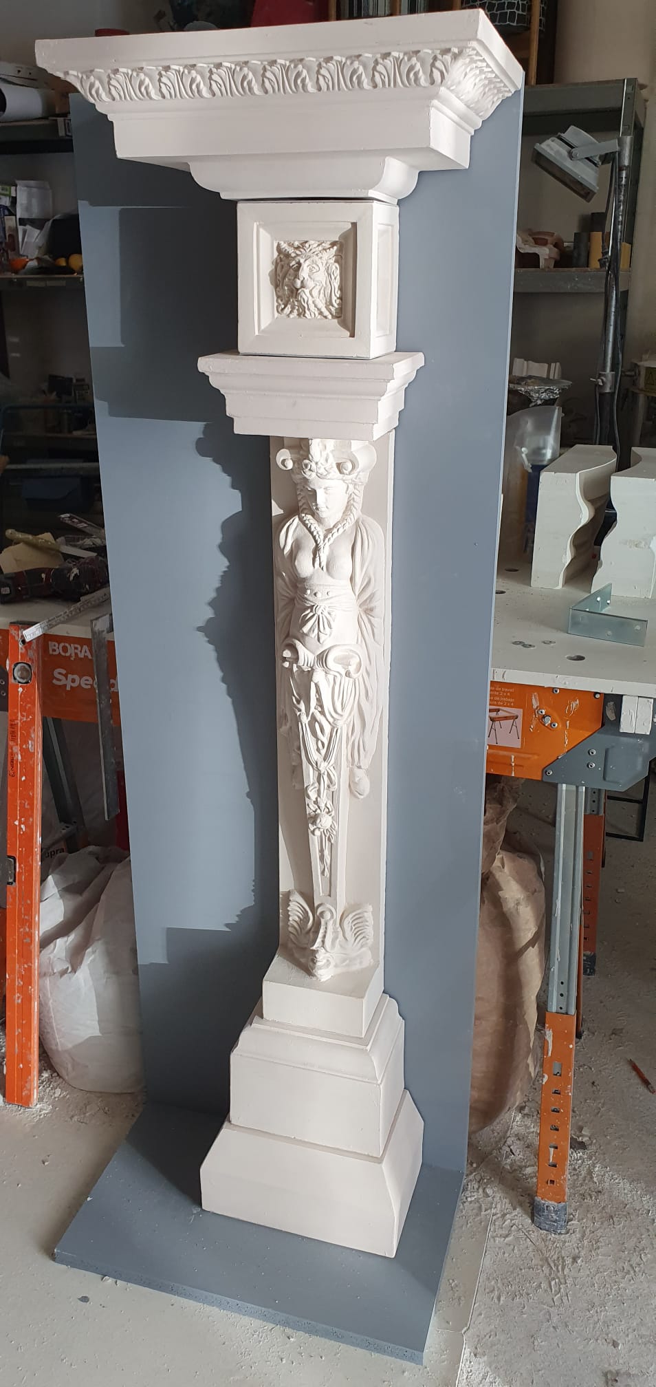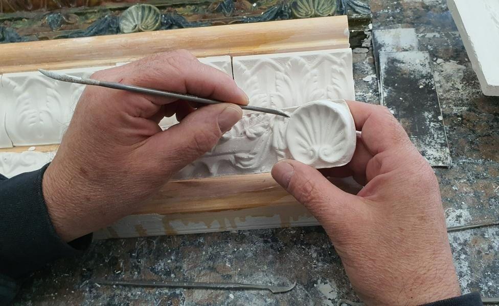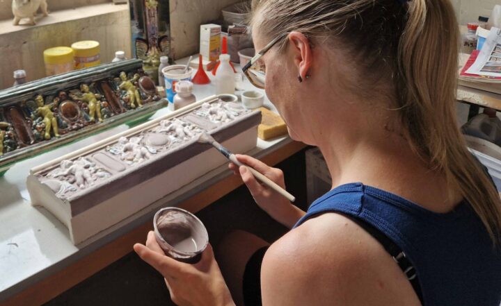 Die Wiederherstellung des Kachelkamins erfolgte in mehreren Arbeitsschritten. Zunächst wurden in der Werkstatt Modelle der unterschiedlich gestalteten Kacheln geformt.