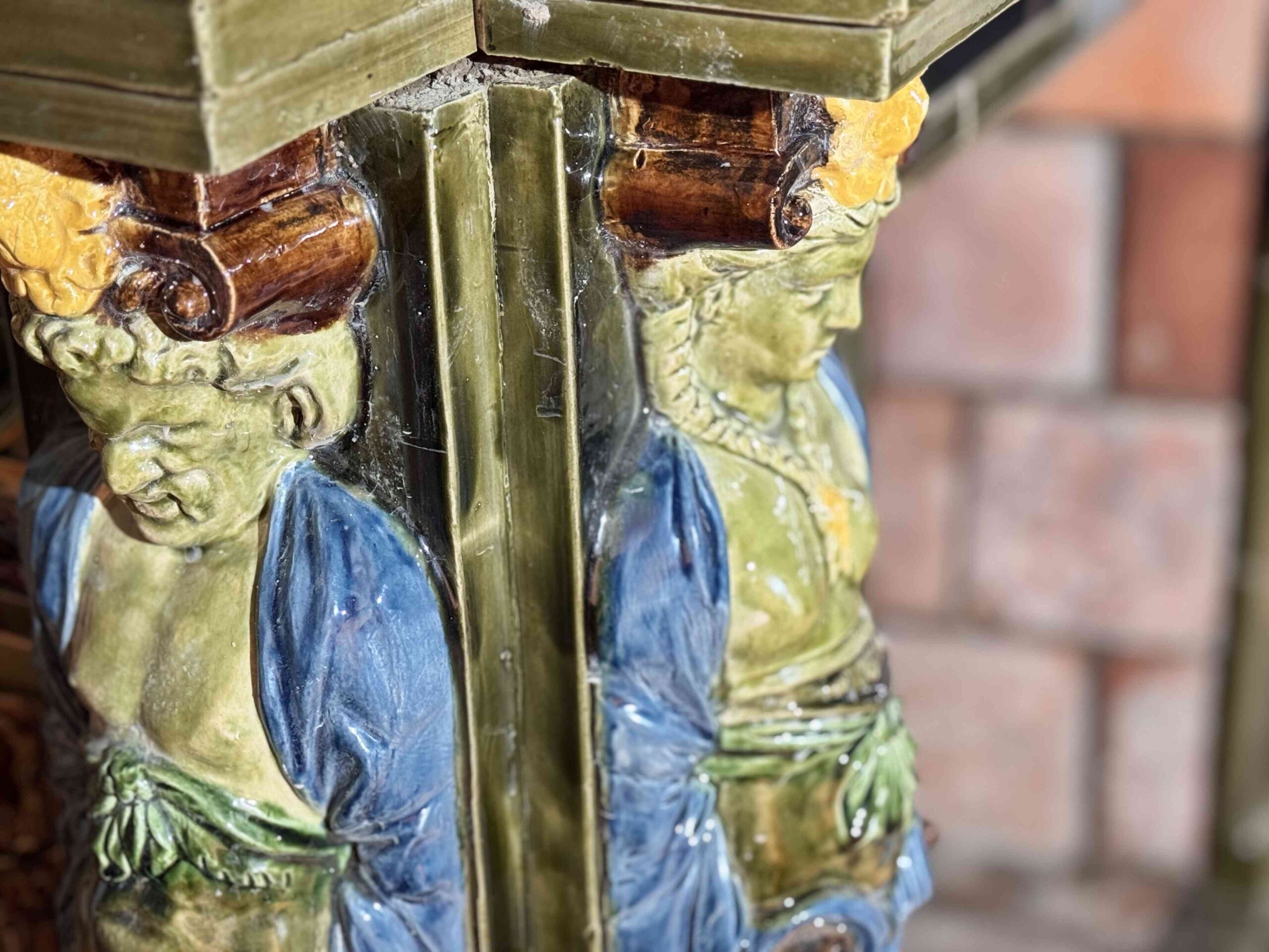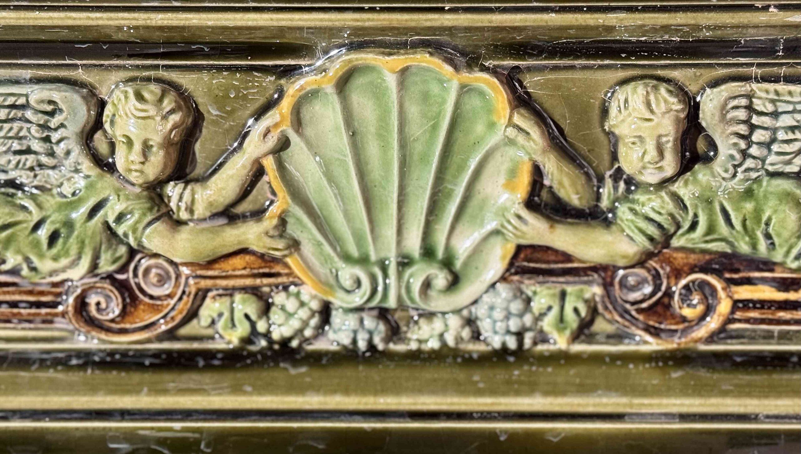 Die Reliefs der glasierten Kacheln zeigen unterschiedliche figürliche und ornamentale Motive: Die Feuerstelle wird von Hermen flankiert, unter dem Kamintisch halten Putti im Fries Muscheln. Auch der Aufsatz ist reich geschmückt, unter anderem mit weiteren Putti und Muschelornamenten.